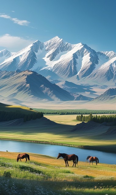 【AIGC】新疆阿勒泰自然风景,山和草原上的马
