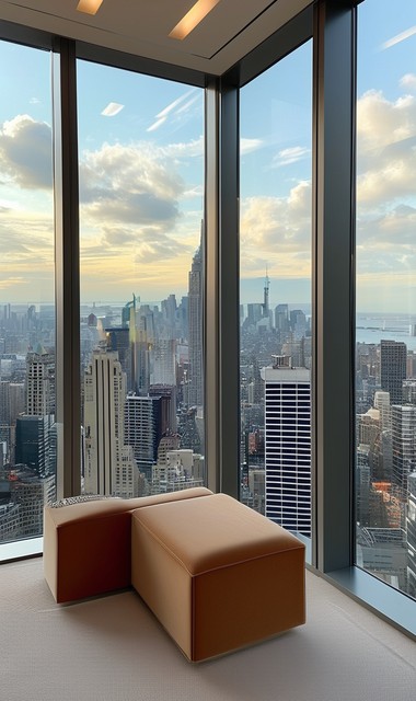 一个拥有落地窗和城市景观的虚拟试衣间