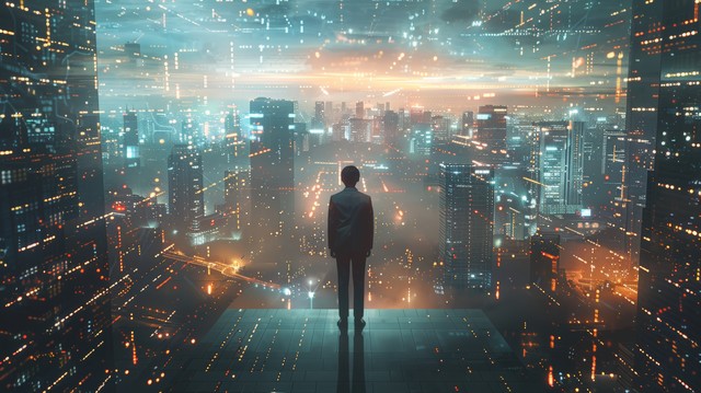 商人站在充满未来网络技术的城市环境中,周围是高科技建筑和数字信息流,