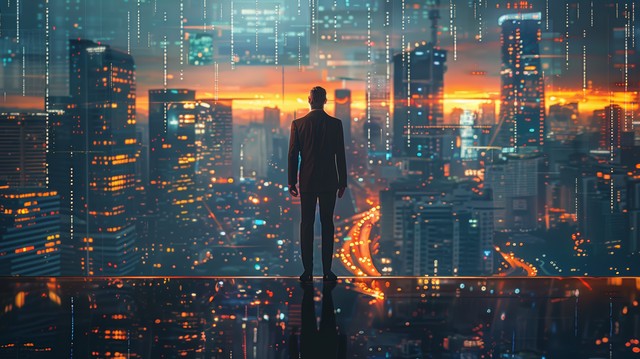 商人站在充满未来网络技术的城市环境中,周围是高科技建筑和数字信息流,