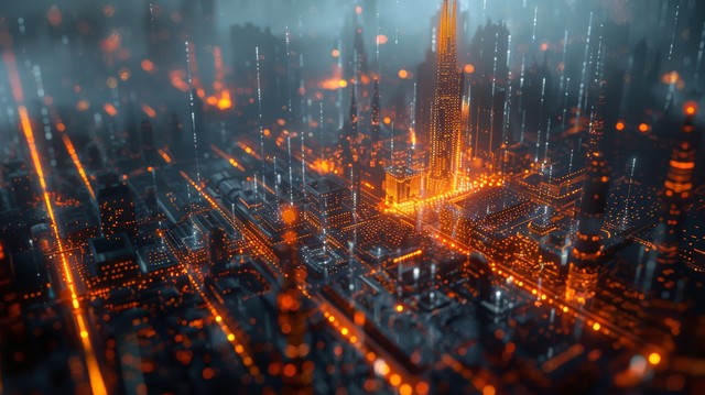 网络节点,现代创意的网络节点在智慧城市中互联,在5G和无线技术的先进数字连接中