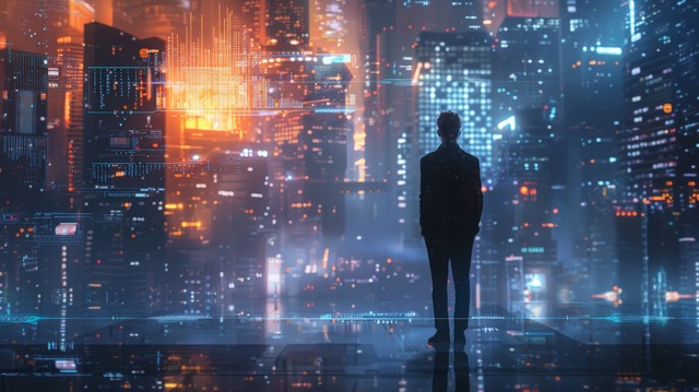 商人站在充满未来网络技术的城市环境中,周围是高科技建筑和数字信息流,
