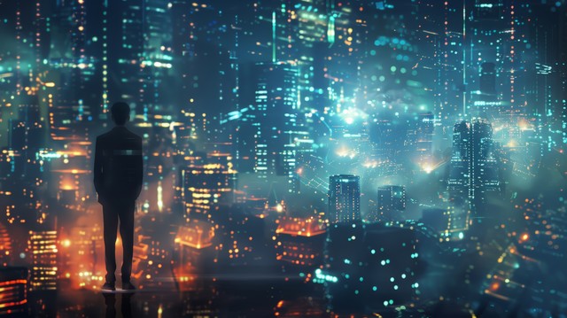 商人站在充满未来网络技术的城市环境中,周围是高科技建筑和数字信息流,