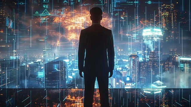 商人站在充满未来网络技术的城市环境中,周围是高科技建筑和数字信息流,