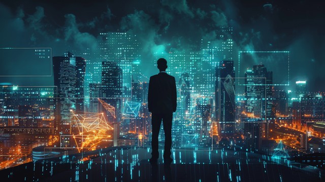 商人站在充满未来网络技术的城市环境中,周围是高科技建筑和数字信息流,