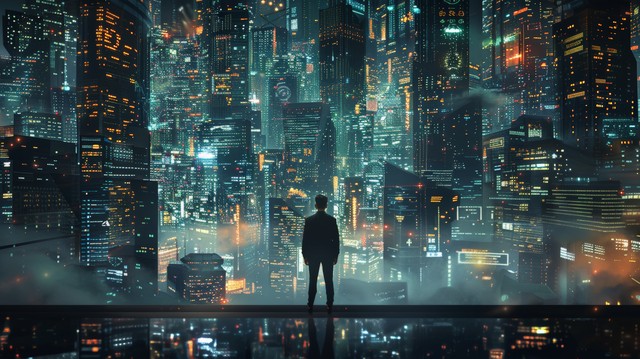 商人站在充满未来网络技术的城市环境中,周围是高科技建筑和数字信息流,