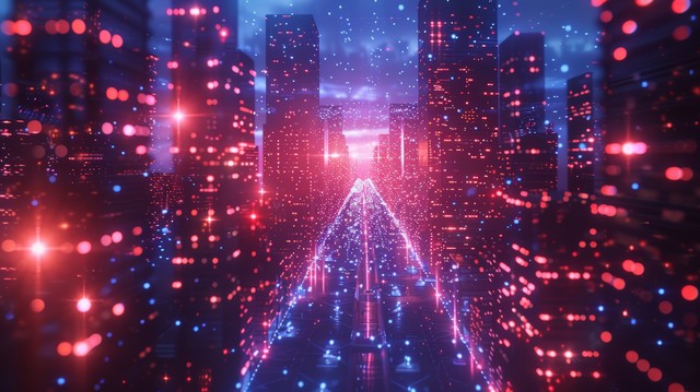 网络节点,现代创意的网络节点在智慧城市中互联,在5G和无线技术的先进数字连接中