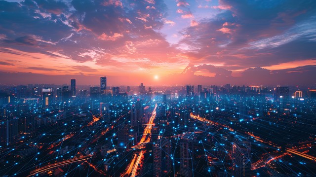 网络节点,现代创意的网络节点在智慧城市中互联,在5G和无线技术的先进数字连接中