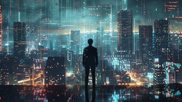 商人站在充满未来网络技术的城市环境中,周围是高科技建筑和数字信息流,