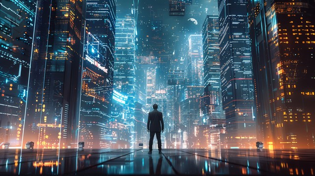 商人站在充满未来网络技术的城市环境中,周围是高科技建筑和数字信息流,