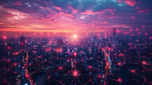 网络节点,现代创意的网络节点在智慧城市中互联,在5G和无线技术的先进数字连接中