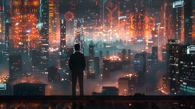 商人站在充满未来网络技术的城市环境中,周围是高科技建筑和数字信息流,