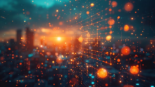 网络节点,现代创意的网络节点在智慧城市中互联,在5G和无线技术的先进数字连接中
