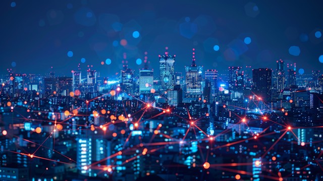 网络节点,现代创意的网络节点在智慧城市中互联,在5G和无线技术的先进数字连接中