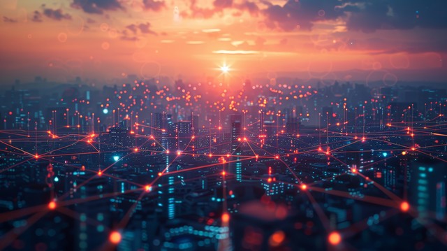 网络节点,现代创意的网络节点在智慧城市中互联,在5G和无线技术的先进数字连接中