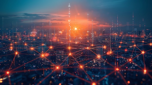 网络节点,现代创意的网络节点在智慧城市中互联,在5G和无线技术的先进数字连接中