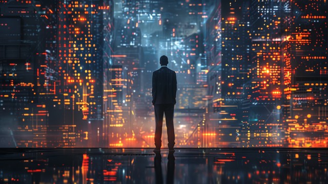 商人站在充满未来网络技术的城市环境中,周围是高科技建筑和数字信息流,