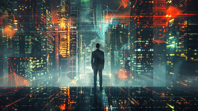 商人站在充满未来网络技术的城市环境中,周围是高科技建筑和数字信息流,