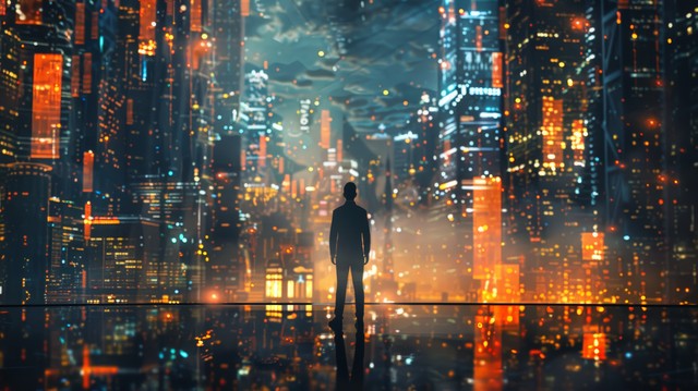 商人站在充满未来网络技术的城市环境中,周围是高科技建筑和数字信息流,