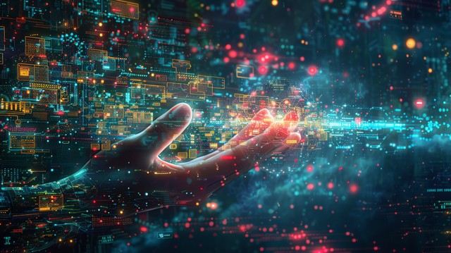 手握着代表数字技术的元素,在充满数字化符号和界面的抽象背景中,