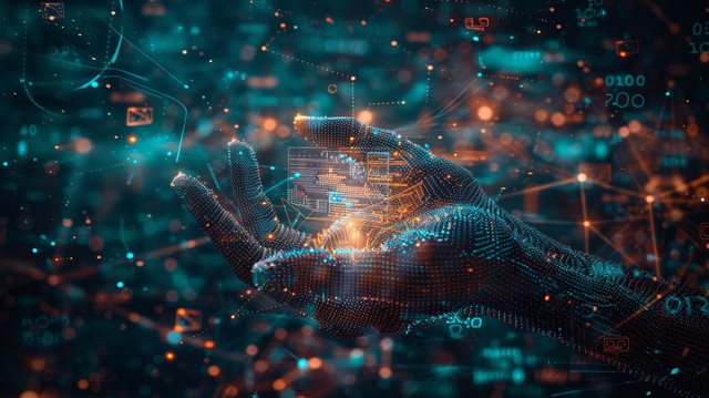 手握着代表数字技术的元素,在充满数字化符号和界面的抽象背景中,