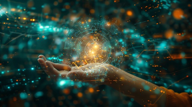 手握着代表数字技术的元素,在充满数字化符号和界面的抽象背景中,