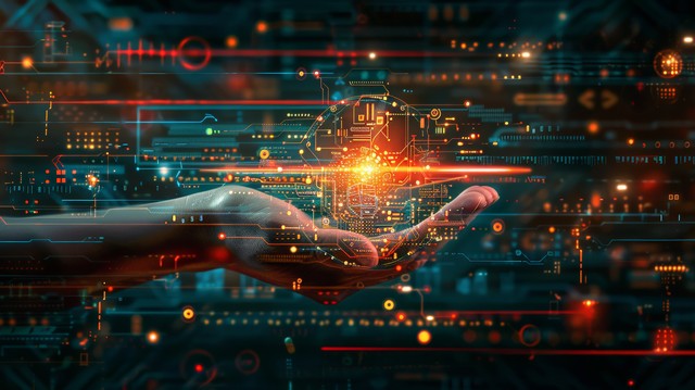 手握着代表数字技术的元素,在充满数字化符号和界面的抽象背景中,