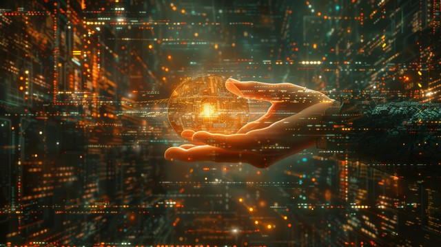 手握着代表数字技术的元素,在充满数字化符号和界面的抽象背景中,