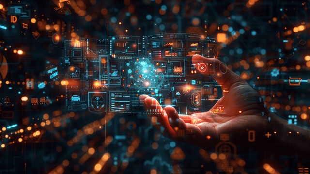 手握着代表数字技术的元素,在充满数字化符号和界面的抽象背景中,
