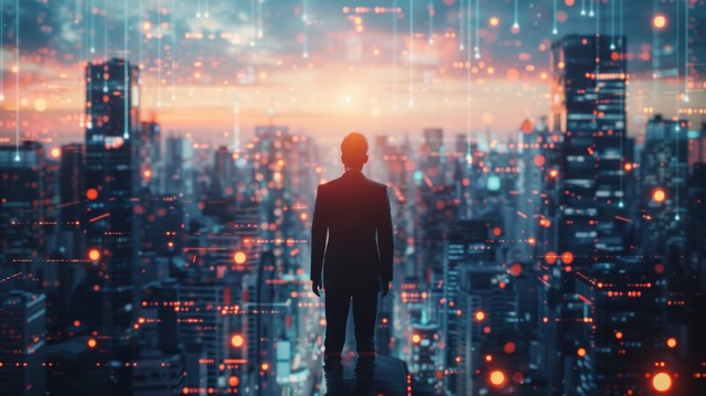 商人站在充满未来网络技术的城市环境中,周围是高科技建筑和数字信息流,