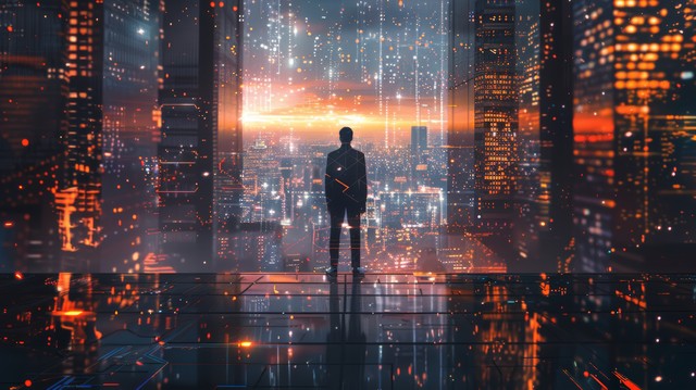 商人站在充满未来网络技术的城市环境中,周围是高科技建筑和数字信息流,