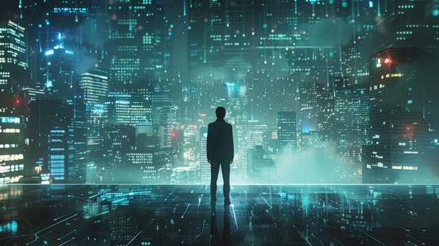 商人站在充满未来网络技术的城市环境中,周围是高科技建筑和数字信息流,