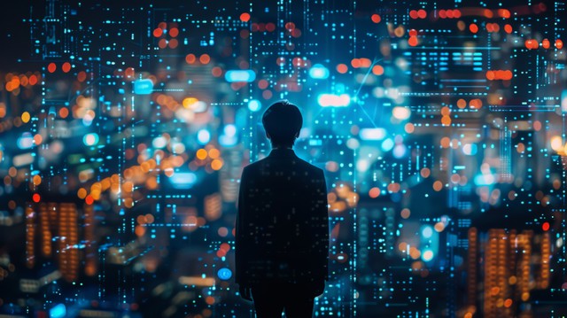 商人站在充满未来网络技术的城市环境中,周围是高科技建筑和数字信息流,