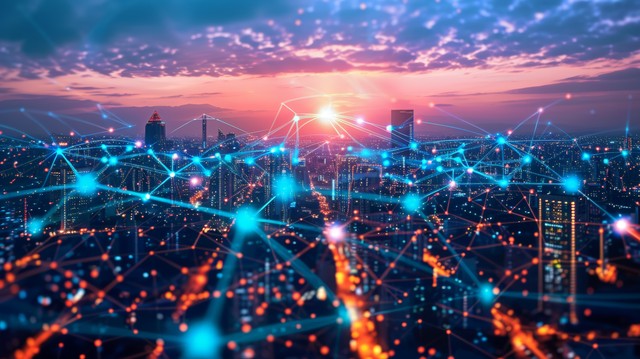 网络节点,现代创意的网络节点在智慧城市中互联,在5G和无线技术的先进数字连接中