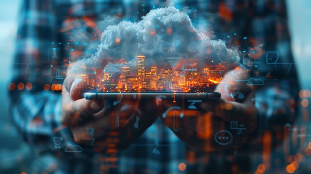 云技术,云技术在商业交易中与互联网和无线网络融合,商人的智能手机和商业城市背景中