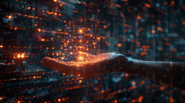 手握着代表数字技术的元素,在充满数字化符号和界面的抽象背景中,