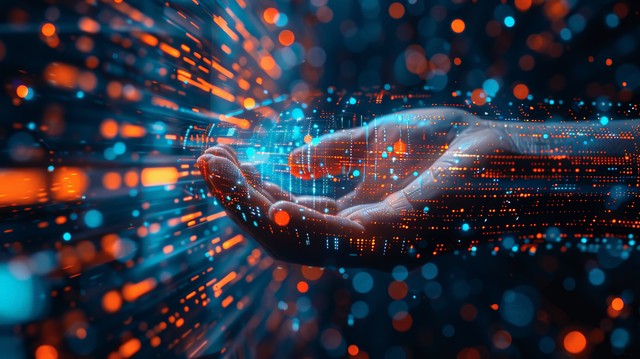 手握着代表数字技术的元素,在充满数字化符号和界面的抽象背景中,