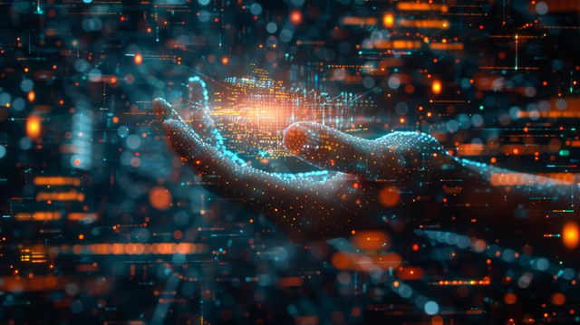 手握着代表数字技术的元素,在充满数字化符号和界面的抽象背景中,