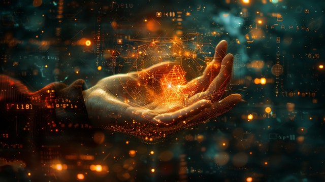 手握着代表数字技术的元素,在充满数字化符号和界面的抽象背景中,