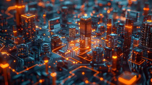 网络节点,现代创意的网络节点在智慧城市中互联,在5G和无线技术的先进数字连接中