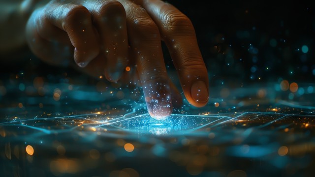 手按下代表创新技术的按钮,在未来互联网网络接口的金融科技形象和商城中