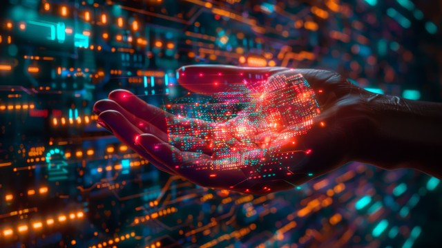 手握着代表数字技术的元素,在充满数字化符号和界面的抽象背景中,