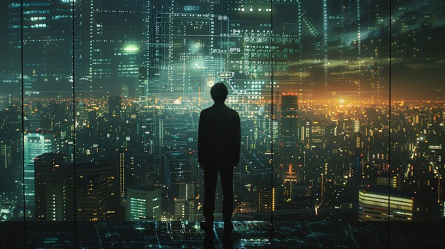 商人站在充满未来网络技术的城市环境中,周围是高科技建筑和数字信息流,