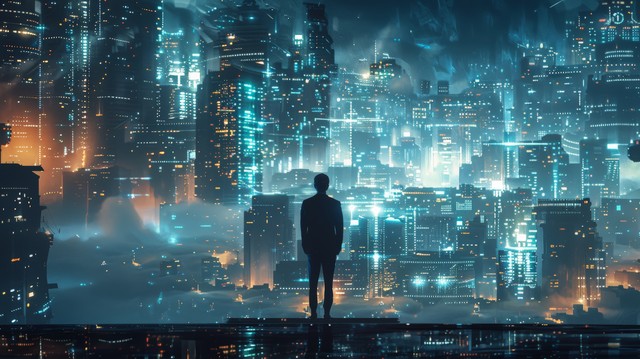 商人站在充满未来网络技术的城市环境中,周围是高科技建筑和数字信息流,