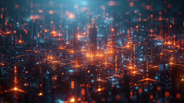 网络节点,现代创意的网络节点在智慧城市中互联,在5G和无线技术的先进数字连接中