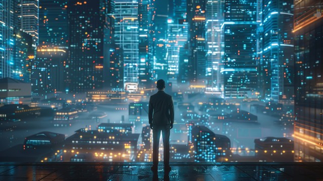 商人站在充满未来网络技术的城市环境中,周围是高科技建筑和数字信息流,