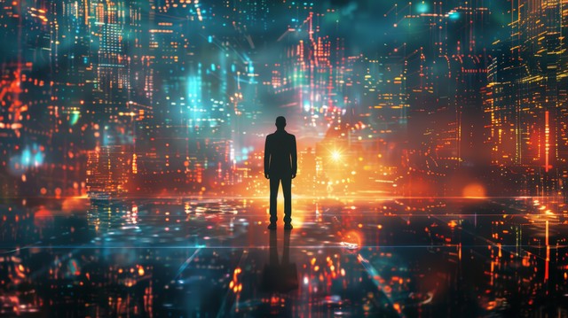 商人站在充满未来网络技术的城市环境中,周围是高科技建筑和数字信息流,