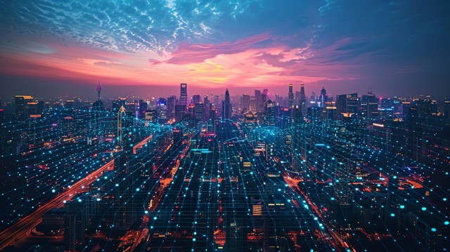 网络节点,现代创意的网络节点在智慧城市中互联,在5G和无线技术的先进数字连接中