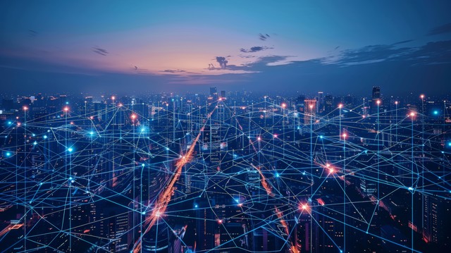网络节点,现代创意的网络节点在智慧城市中互联,在5G和无线技术的先进数字连接中