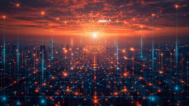 网络节点,现代创意的网络节点在智慧城市中互联,在5G和无线技术的先进数字连接中